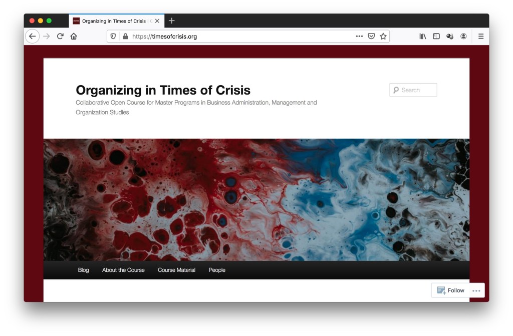 Every summer term I offer the master-level elective module “Current Issues in Theory and Practice of Organizations”. Last year I focused on “Open Organizations and Organizing Openness” with a wiki-based flipped-classroom approach (check out the open access course wiki). In 2020, however, there is no issue more current than the ongoing coronavirus pandemic. As result, I teamed up with Elke Schüßler (University of Linz) to design a collaborative open course on “Organizing in Times of Crisis: The Case of Covid-19”. From the course description: