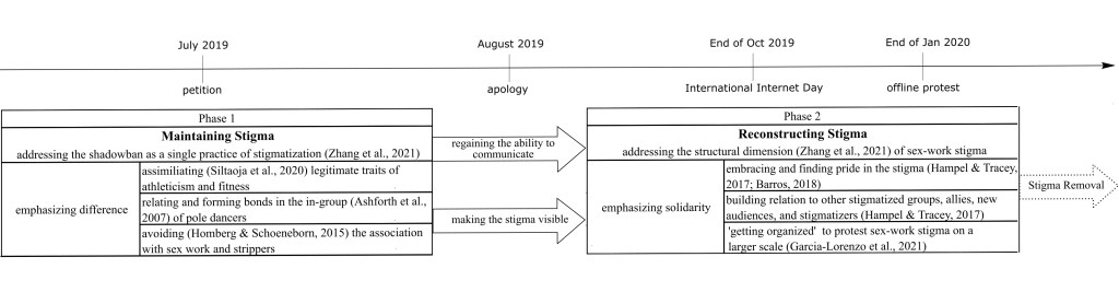 The analysis shows how pole dancers and other stigmatized groups manage stigmatization through a process of stigma maintenance and stigma reconstruction. By emphasizing their difference to sex work through assimilating fitness jargon and distancing themselves from the sex industry, the pole dancers maintain the stigma but regain their communicative abilities by siding with Instagram. This victory initiates a shift in emphasizing solidarity and allows pole dancers and other stigmatized groups to embrace the stigma, forge new ties, and reach out to (non-)stigmatized groups to reconstruct stigma jointly (see Figure 1 below).