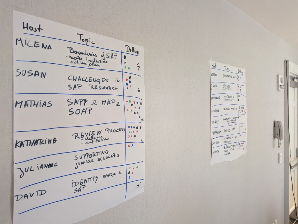 As this year’s chair of the Strategizing Activities and Practices (SAP) Interest Group, I was thus particularly proud that we managed to bring barcamp-style unconferencing ideas to the AoM Annual Meeting. Together with Madalina Pop and Serey Ergene, we invited participants to pitch ideas for 40-minute round table sessions, engaged in “dotmocracy” and joint session planning. By such an approach we sought to create a space that was open for new and unconventional ideas, transcends hierarchies between contributors and audience as well as provides opportunities for networking.
