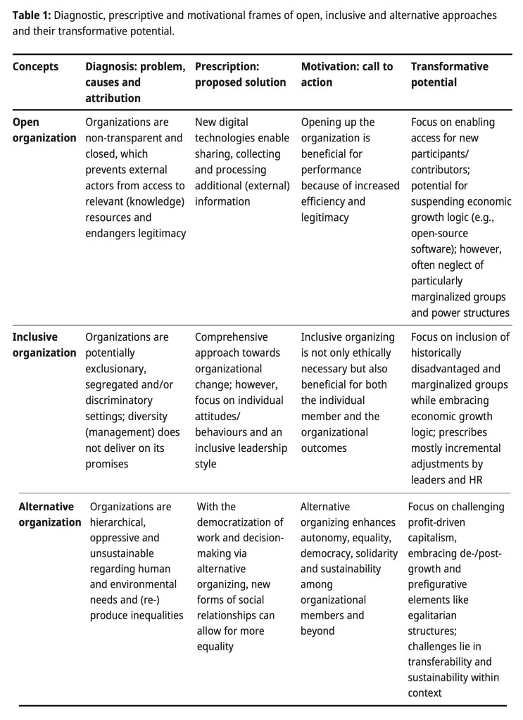 In this chapter, we analyze scholarly approaches that explicitly imagine organizations as capable of ‘doing good’ and investigate which answers they give to the urgent need of stimulating socio-ecological transformations. We compare three streams of literature on open, inclusive and alternative organizations. We define the transformative potential of these approaches as related to ideas of (1) de-/postgrowth and other alternatives to profit-oriented organizing; and of (2) making room for historically disadvantaged and particularly marginalized groups at the organizational power table. In our conclusion, we argue that the scale of transformative change needed asks scholars to transgress commonly separated camps of scholarship and, thus, to eclectically engage with all three organizational approaches to organize for socio-ecological transformations. At the same time, this requires challenging institutionalized underpinnings of how we organize scholarship as such.
